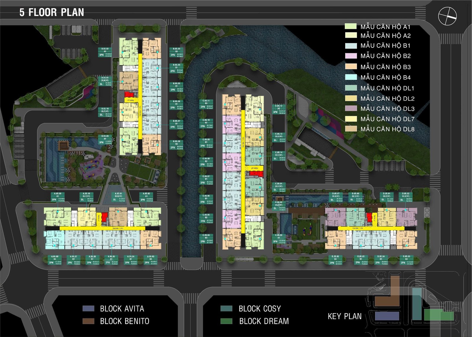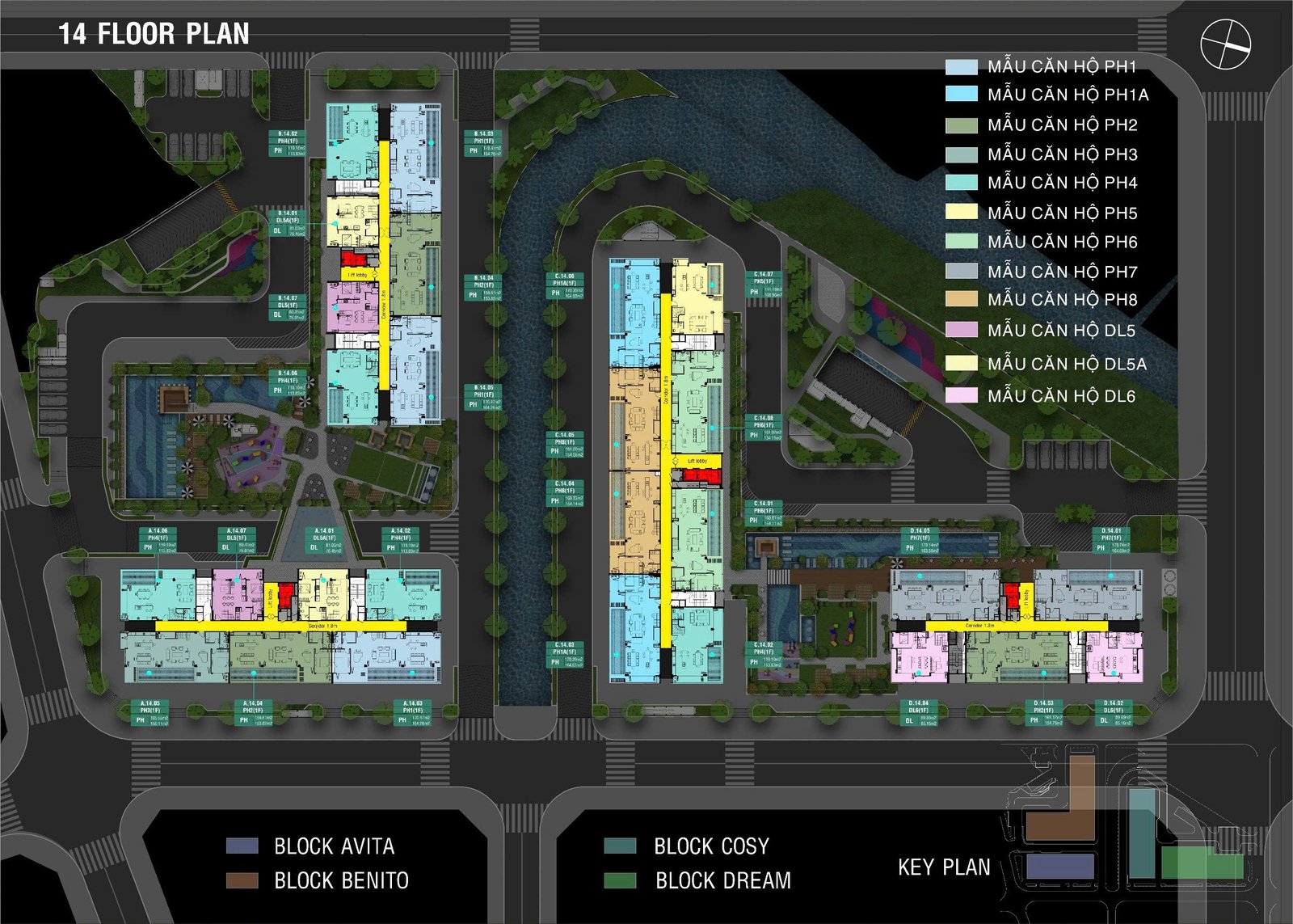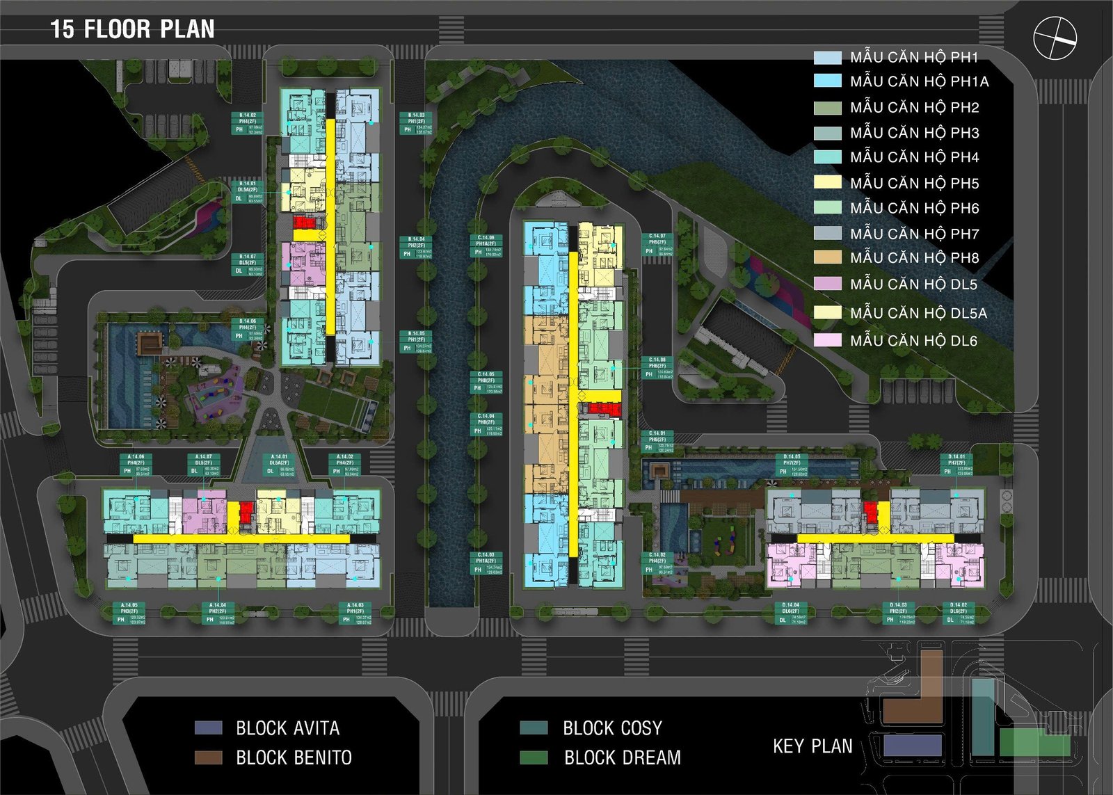 • 4 Tháp: Avita, Benito, Cosy, Dream cao 15 tầng, 2 hầm