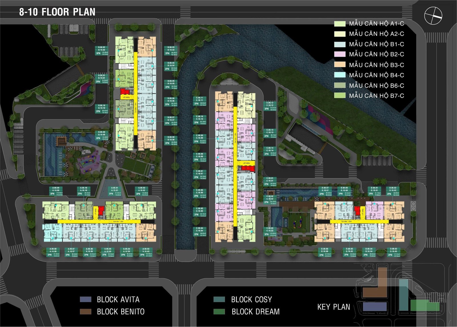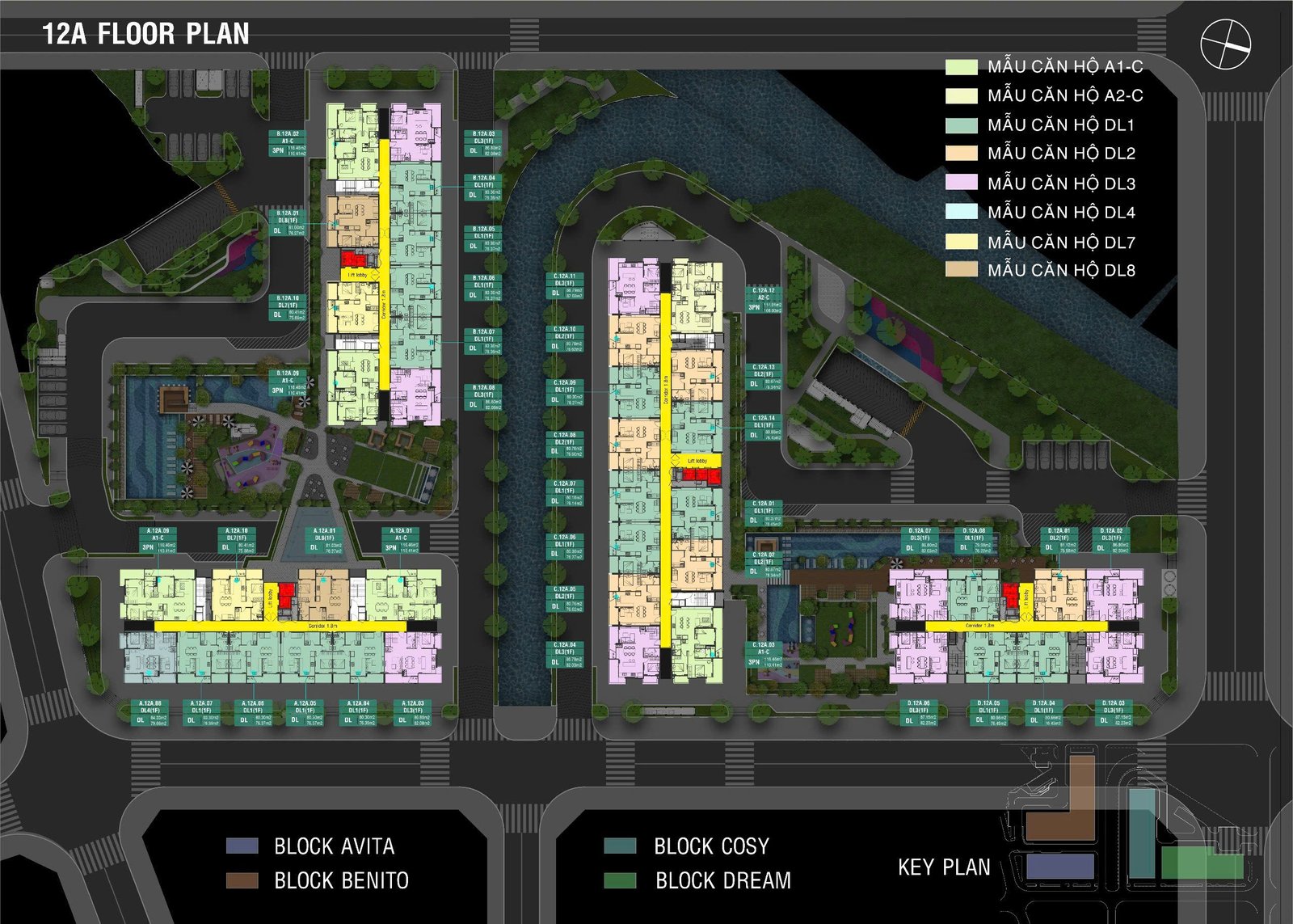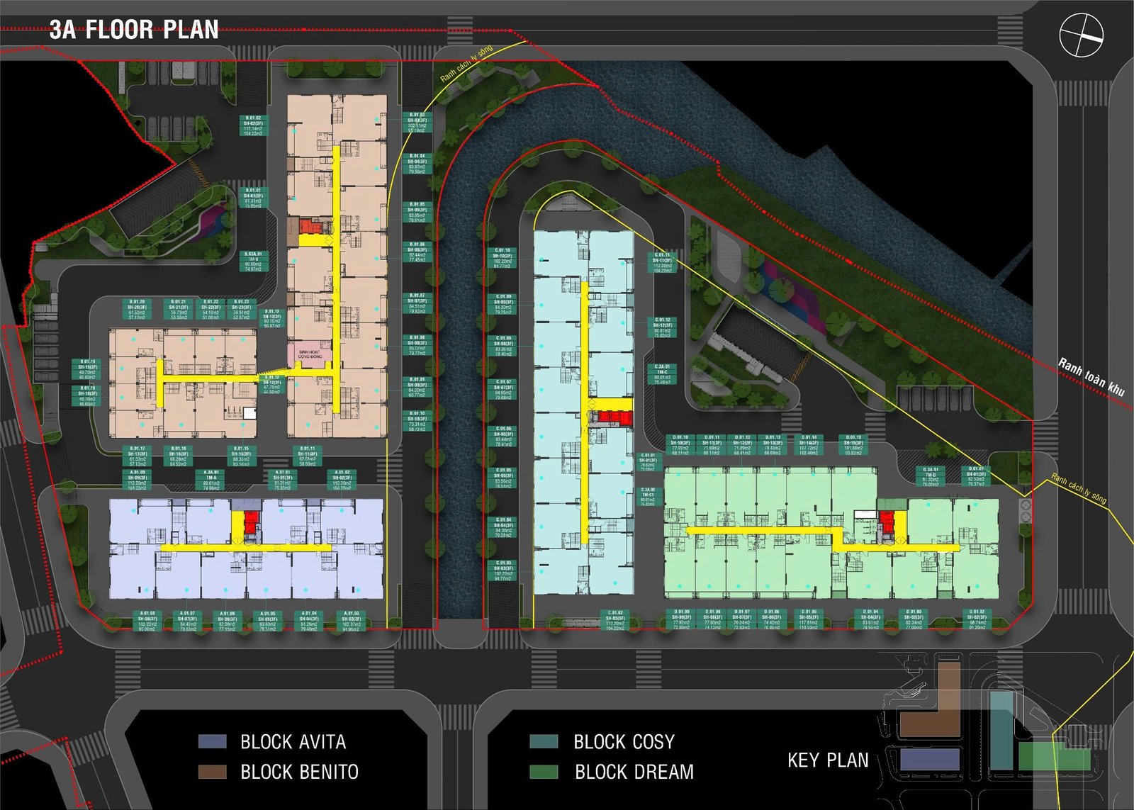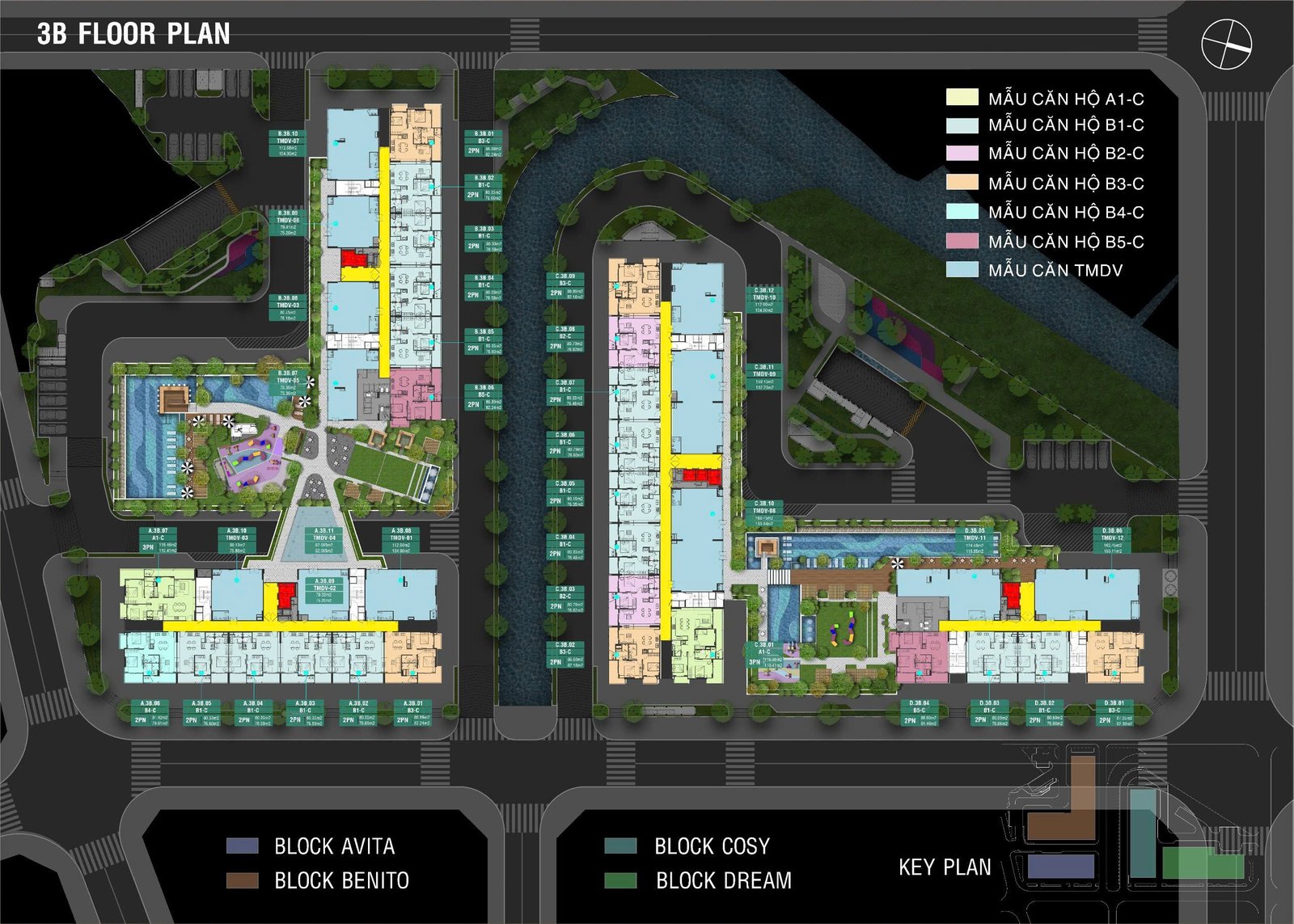 • 4 Tháp: Avita, Benito, Cosy, Dream cao 15 tầng, 2 hầm